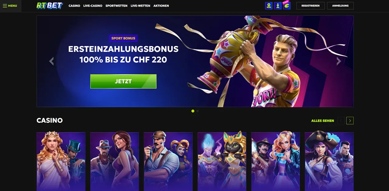 RTbet akzeptiert CHF, EUR, USD sowie Bitcoin, Ethereum, Litecoin und Dogecoin als Kontowährungen. Die Spielbibliothek umfasst über 7300 mobil-optimierte Titel und mehr als 360 Live-Casino-Spiele.