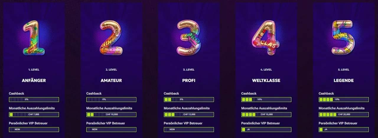 Das VIP-Programm umfasst fünf Stufen: Bronze, Silber, Gold, Platin und Diamant. Jede Stufe bietet progressive Vorteile inkl. erhöhter Cashback-Raten bis 15% (max. CHF 3000 pro Monat), höhere monatliche Auszahlungslimits bis CHF 50000 und persönliche Account-Manager ab Gold-Status.